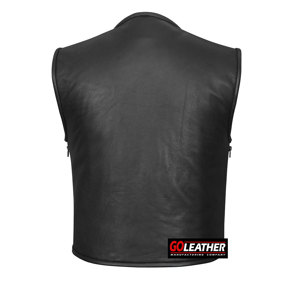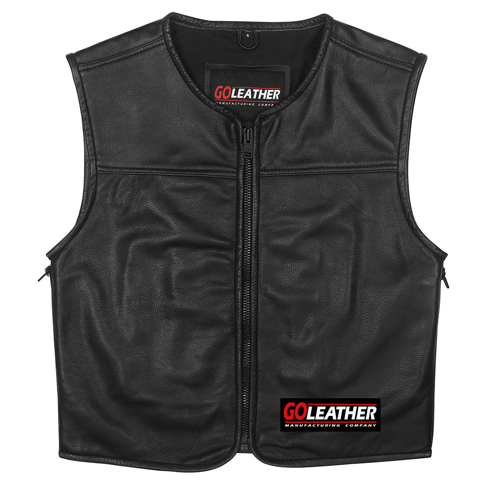 This is our NEW exclusive club 545 vest. It is a proper fitting club vest with full side release zippers. The zippered sides are used instead of side laces; Just unzip the sides to give you the extra room needed when wearing the vest over a leather jacket etc. This vest does not have any exterior pockets which make it great for patches and side rockers. The single back panel is perfect for club colors. The vest is made from naked cowhide leather which is a premium plush leather.