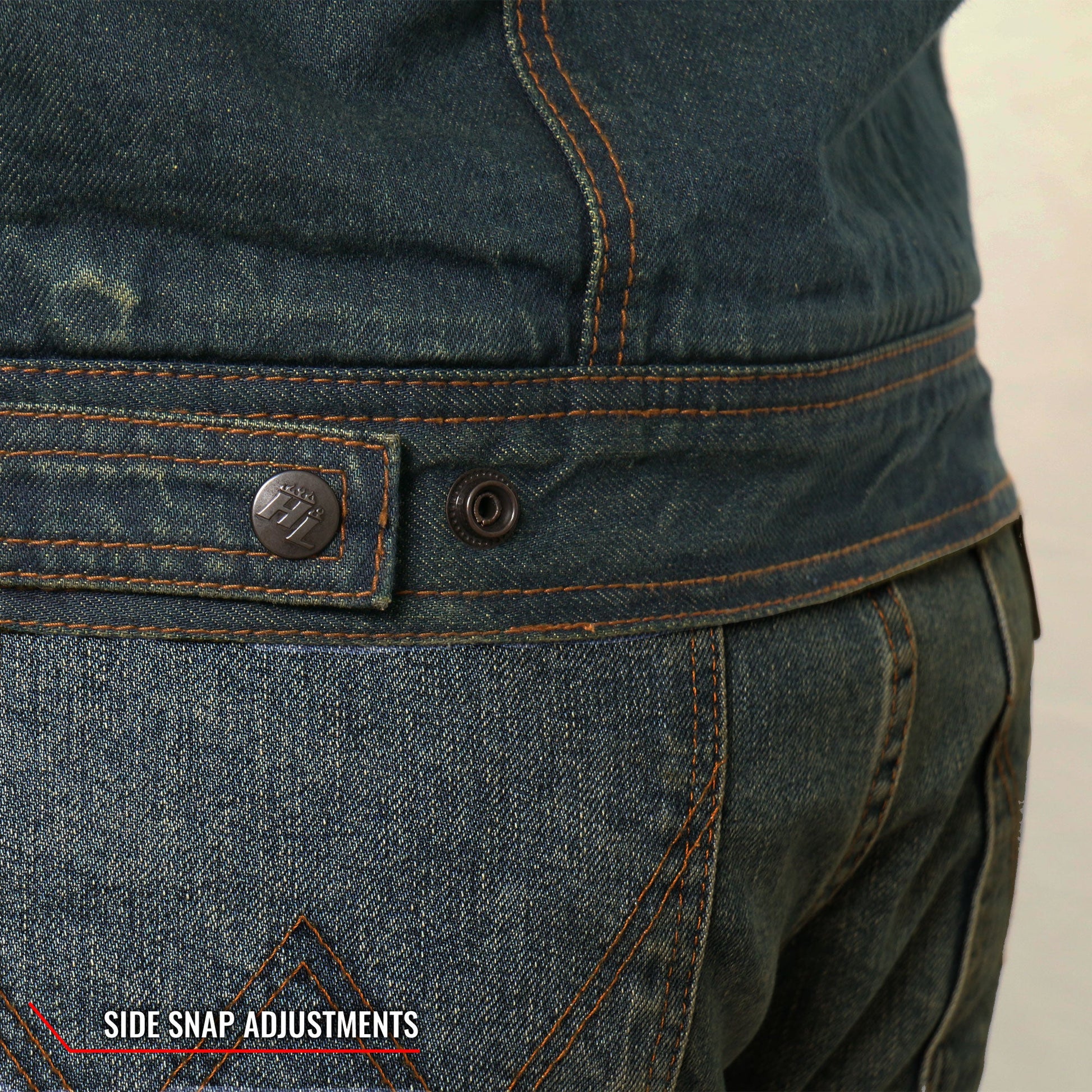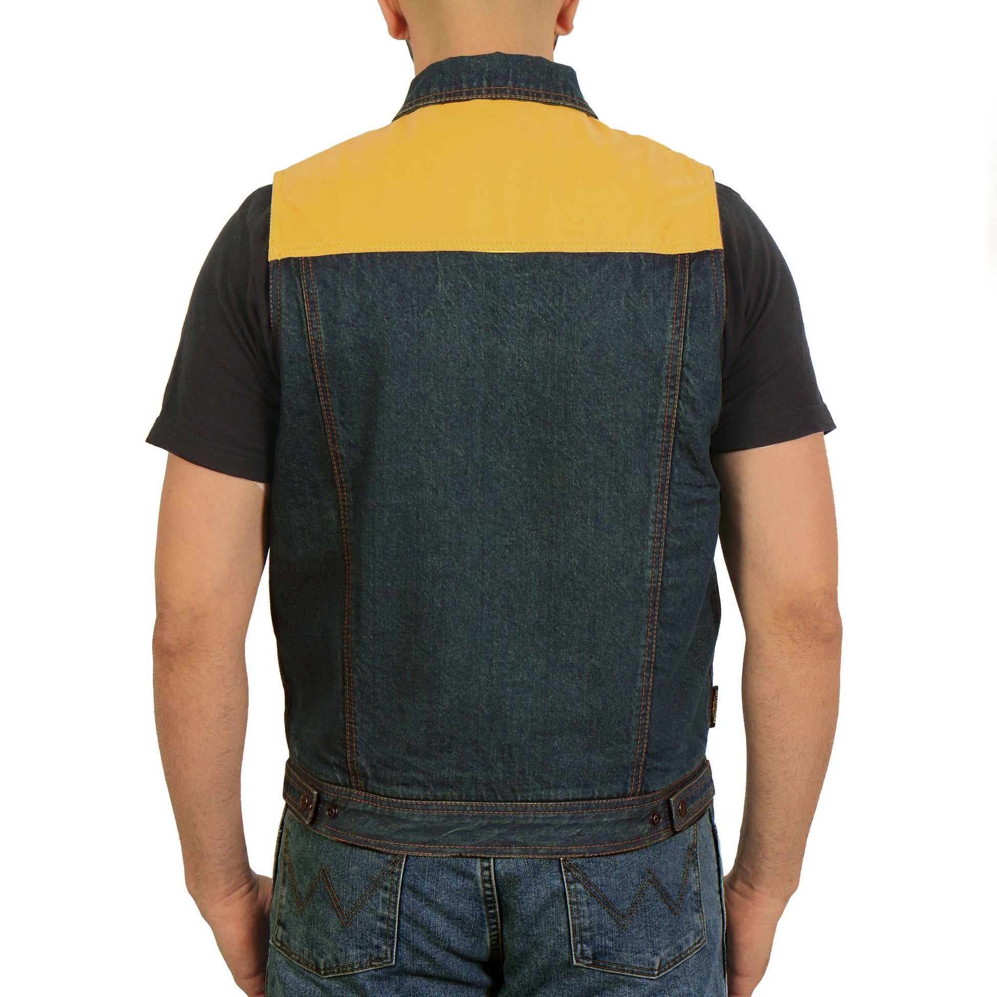 The perfect vest for a beautiful spring or fall ride. The shoulders are reinforced with a super soft golden yellow deerskin leather that combined with a breathable denim make this the most comfortable vest for you. Features of this vest include a hidden snap-down collar, Duel inner concealed carry pockets and 4 outer pockets. There is also an inner zipper on the liner for easy application of all your favorite patches.