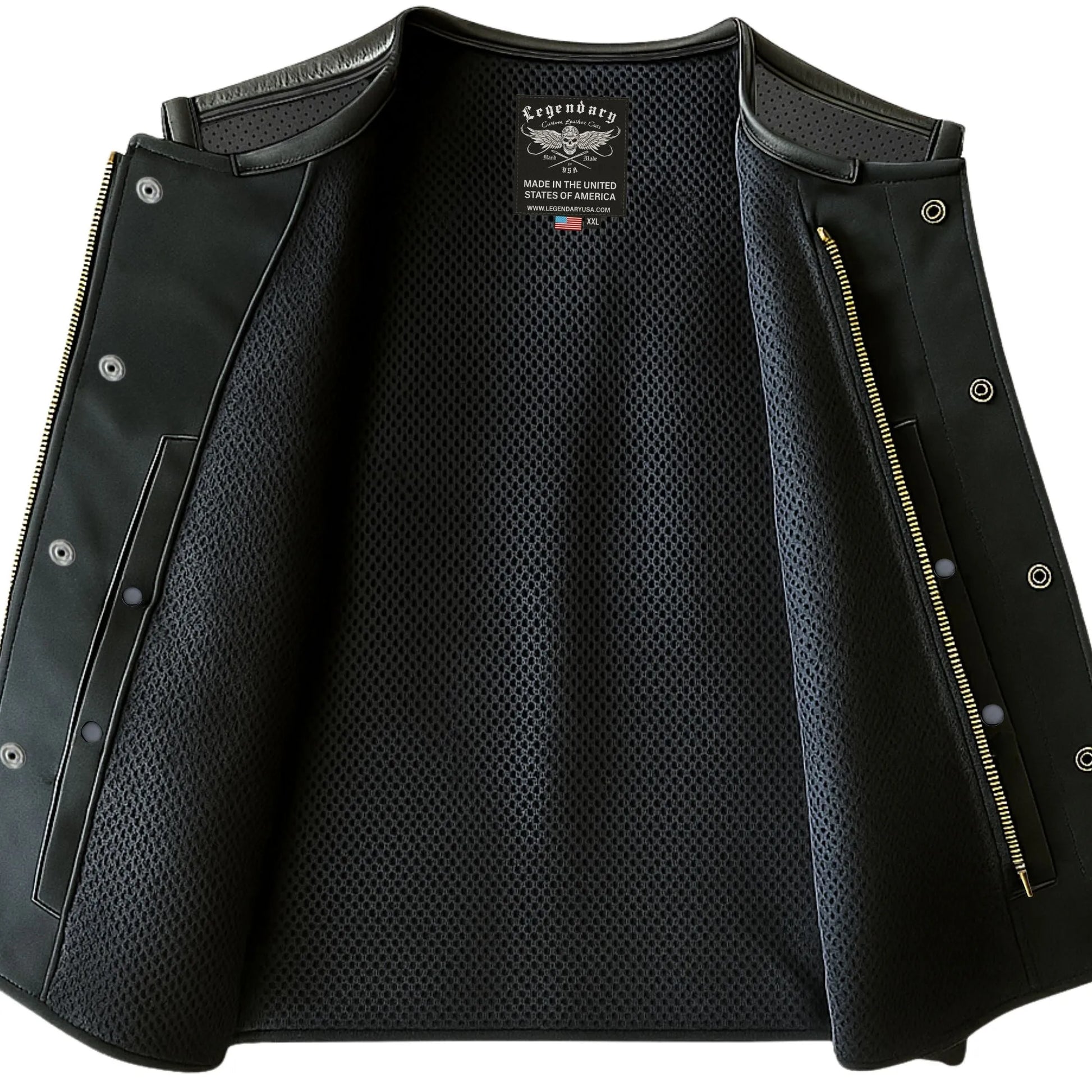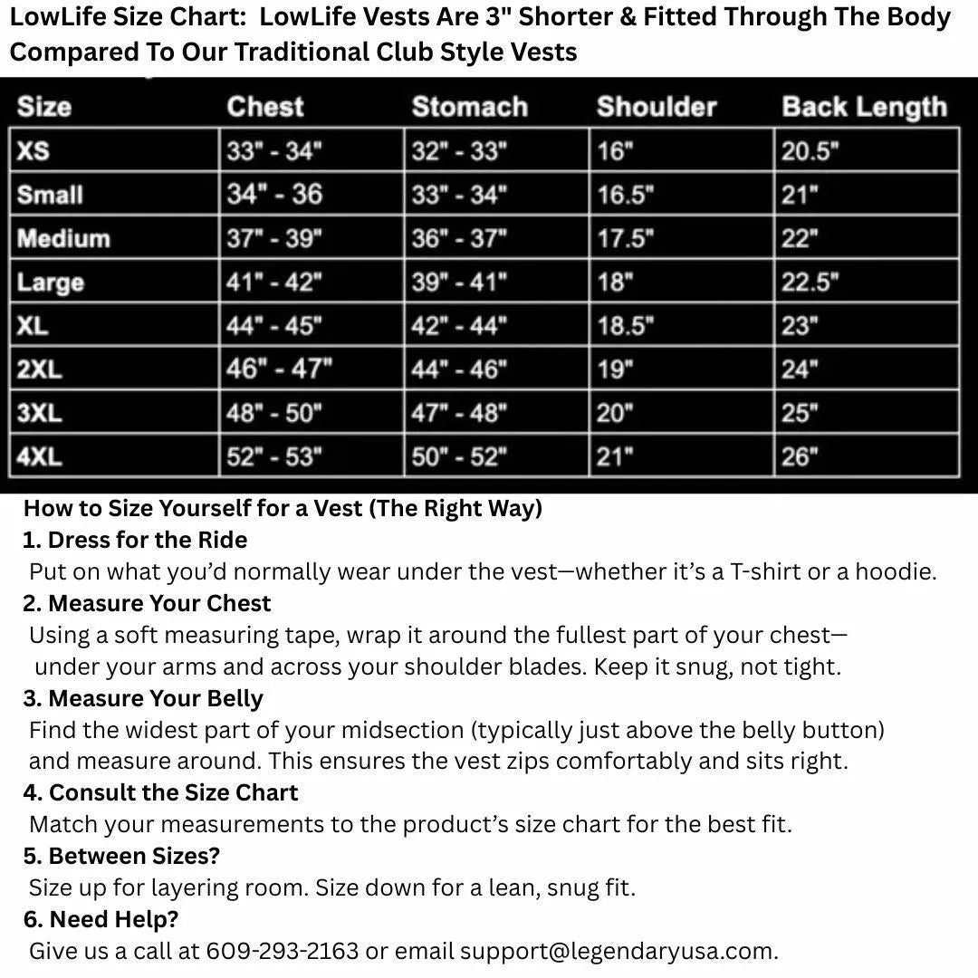 Legendary LowLife Perforated Cropped Leather Motorcycle Vest is built with rugged 1.4mm naked perforated cowhide leather for added durability. This vest is 3" inches shorter than the traditional Legendary USA vest, offering a more cropped fit for comfort while riding. This is a traditional club vest, with a collarless design, the black leather vest has a one-piece back panel, leather-bound armholes, a hidden snap front, and a cropped brass zipper. Perfect for concealed carry, it comes with two secure gun pockets with quick release snap closures. The cropped design and premium features make it ideal for riders who want both style and practicality. Available in Black.