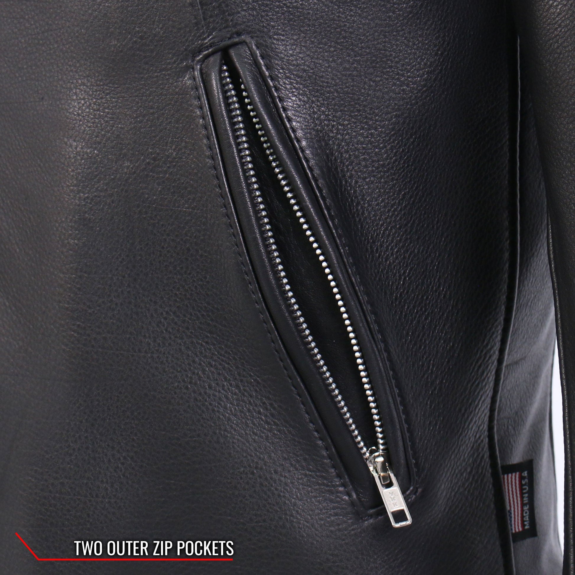 • YKK Premium Metal Zippers A durable, USA made high quality genuine leather men's jacket designed with a snap collar, snap pockets, zipper pockets, a zipper closure on the front with zippers on the back panel.