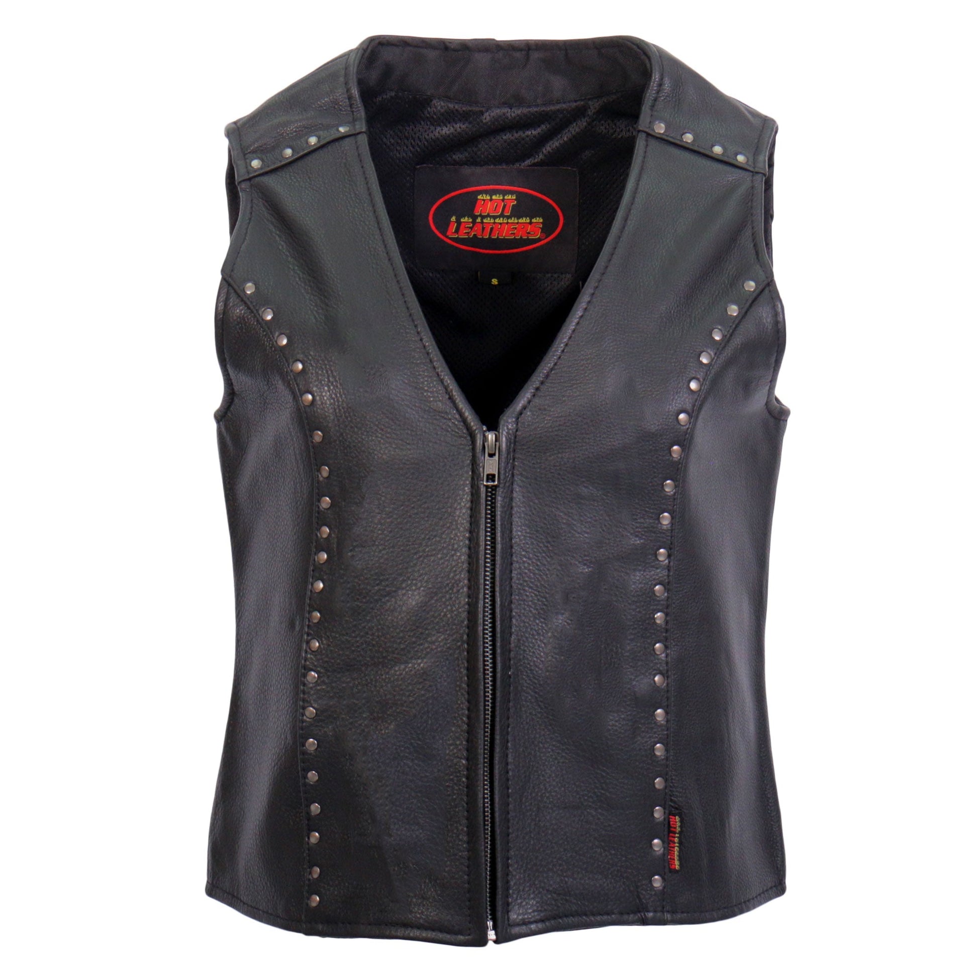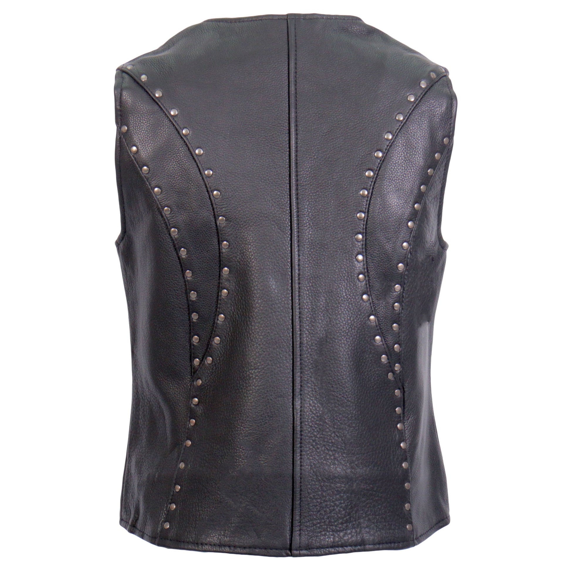 All new ladies leather riding vest from Hot Leathers! This vest is built using naked cowhide and features antique silver stud detail and a full zippered front. There are two outside hidden pockets, dual inside carry conceal pockets and one inside media pocket. It has a solid nylon and mesh combo lining. Another great feature on this vest is the inside hidden patch access zippers. Makes it much easier to have your favorite Hot Leathers patches sewn on.