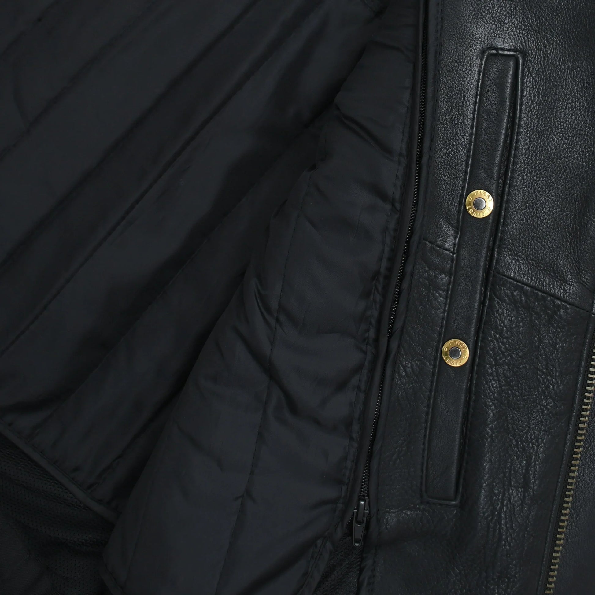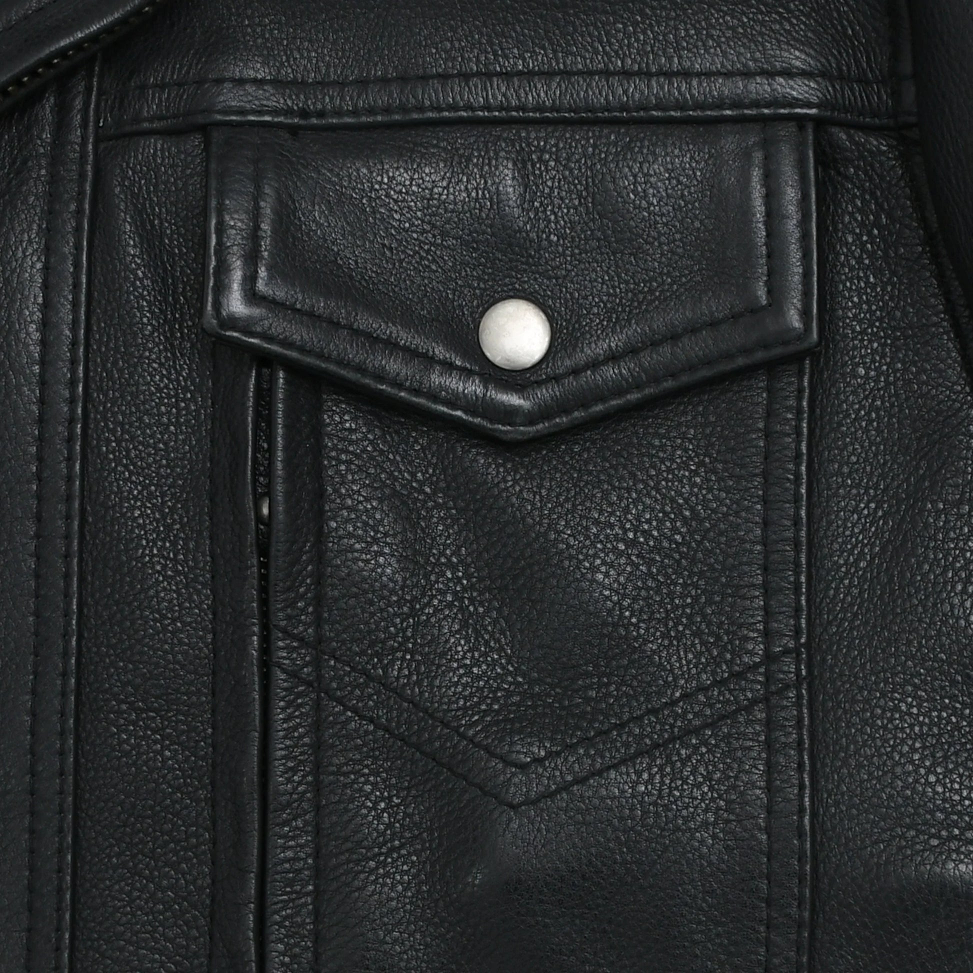 - Motorcycle style with snap down lapel, collar, and asymmetrical zipper