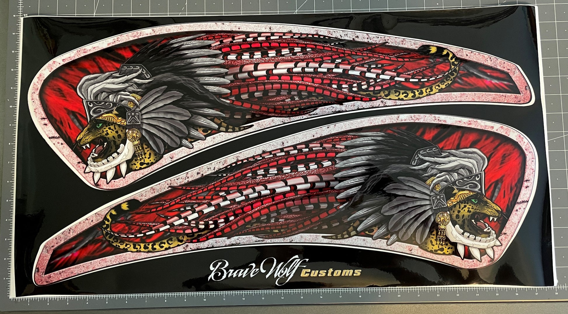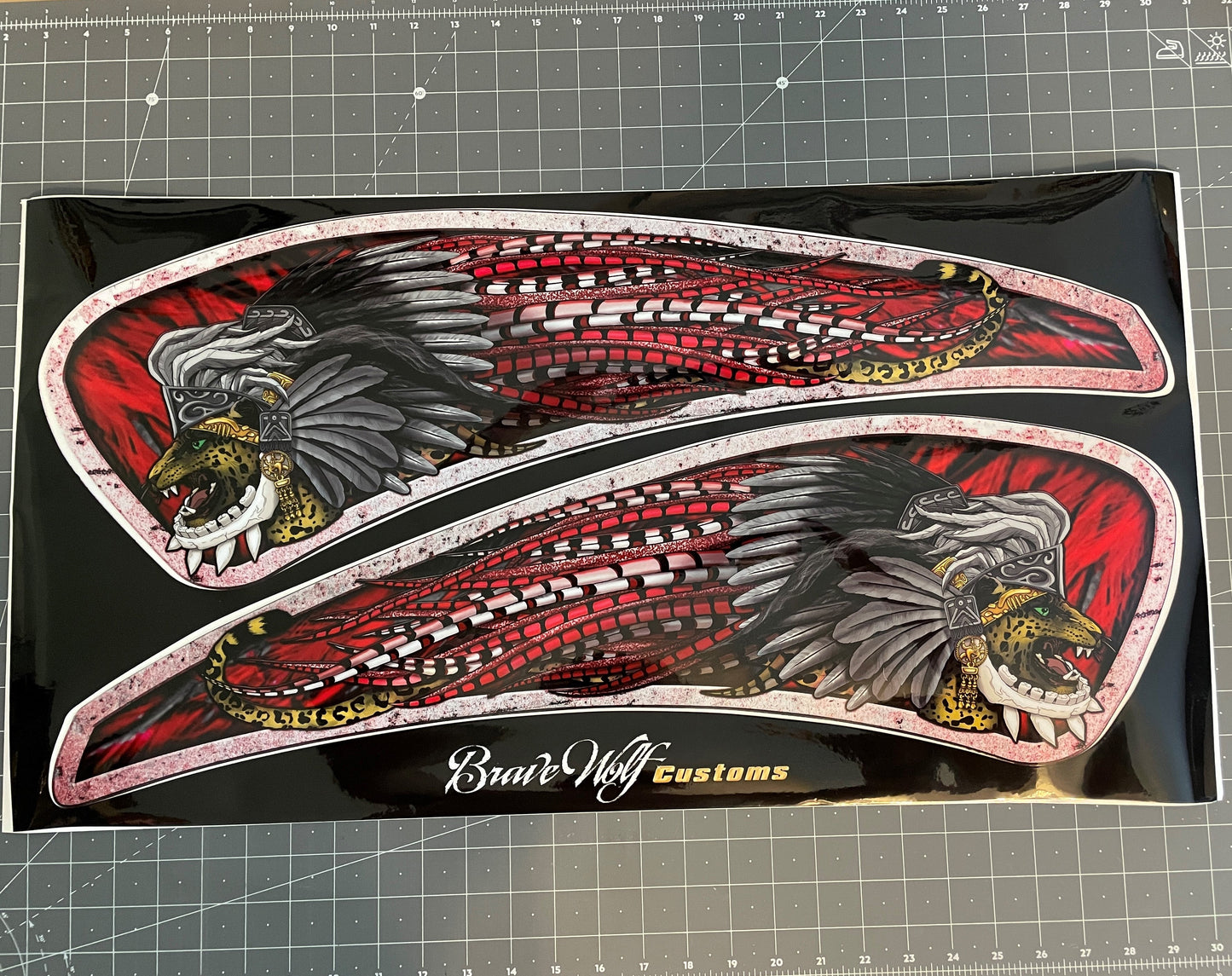 The Aztec Jaguar God of the Underworld is here on our Azteca Challenger fuel tank decals! A unique Native Mesoamerican custom look for your bike starts with these left and right side Aztec/Mayan themed beauties.