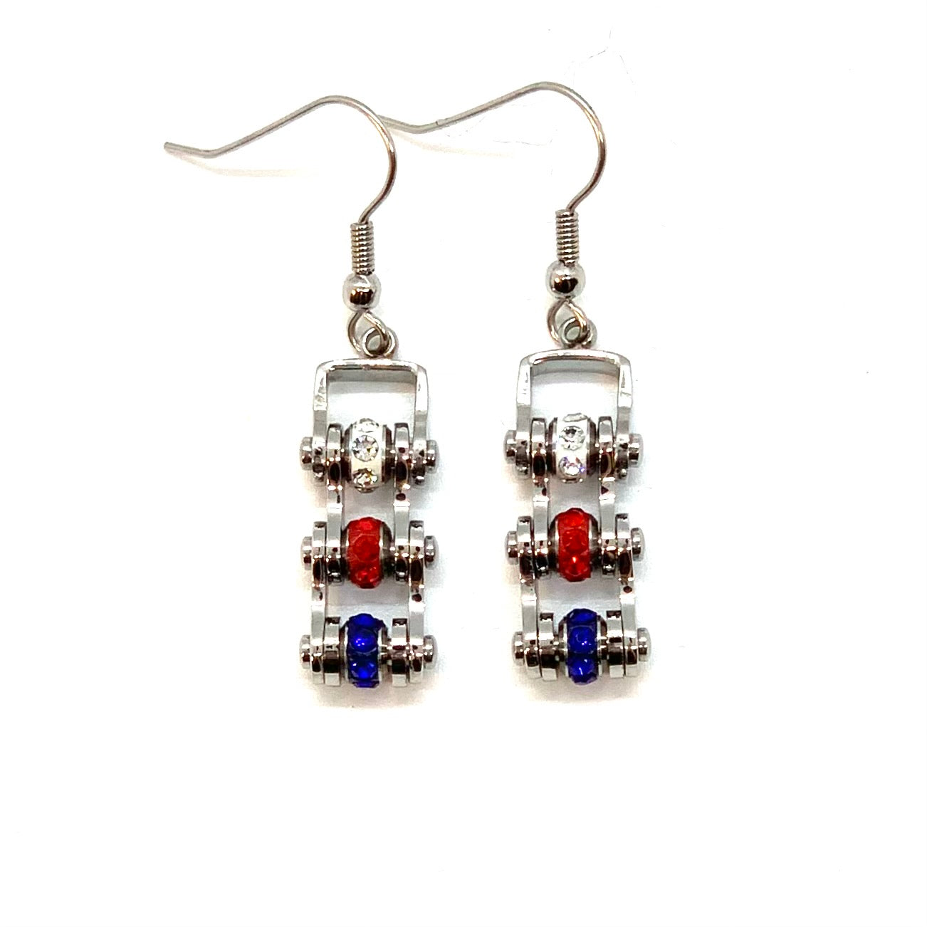 SK2342E MINI MINI Red White and Blue With Crystal Centers Bike Chain Earrings Stainless Steel Motorcycle Biker Jewelry