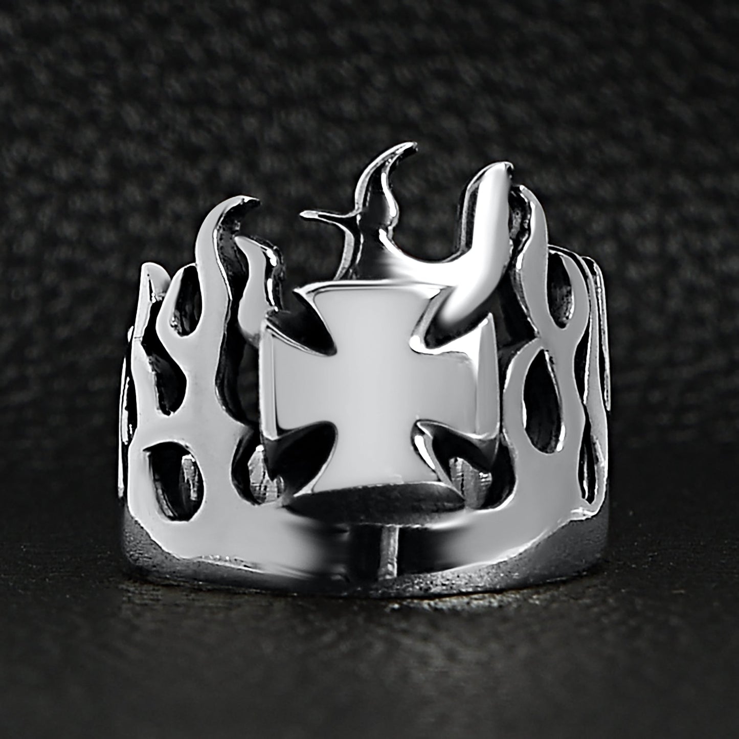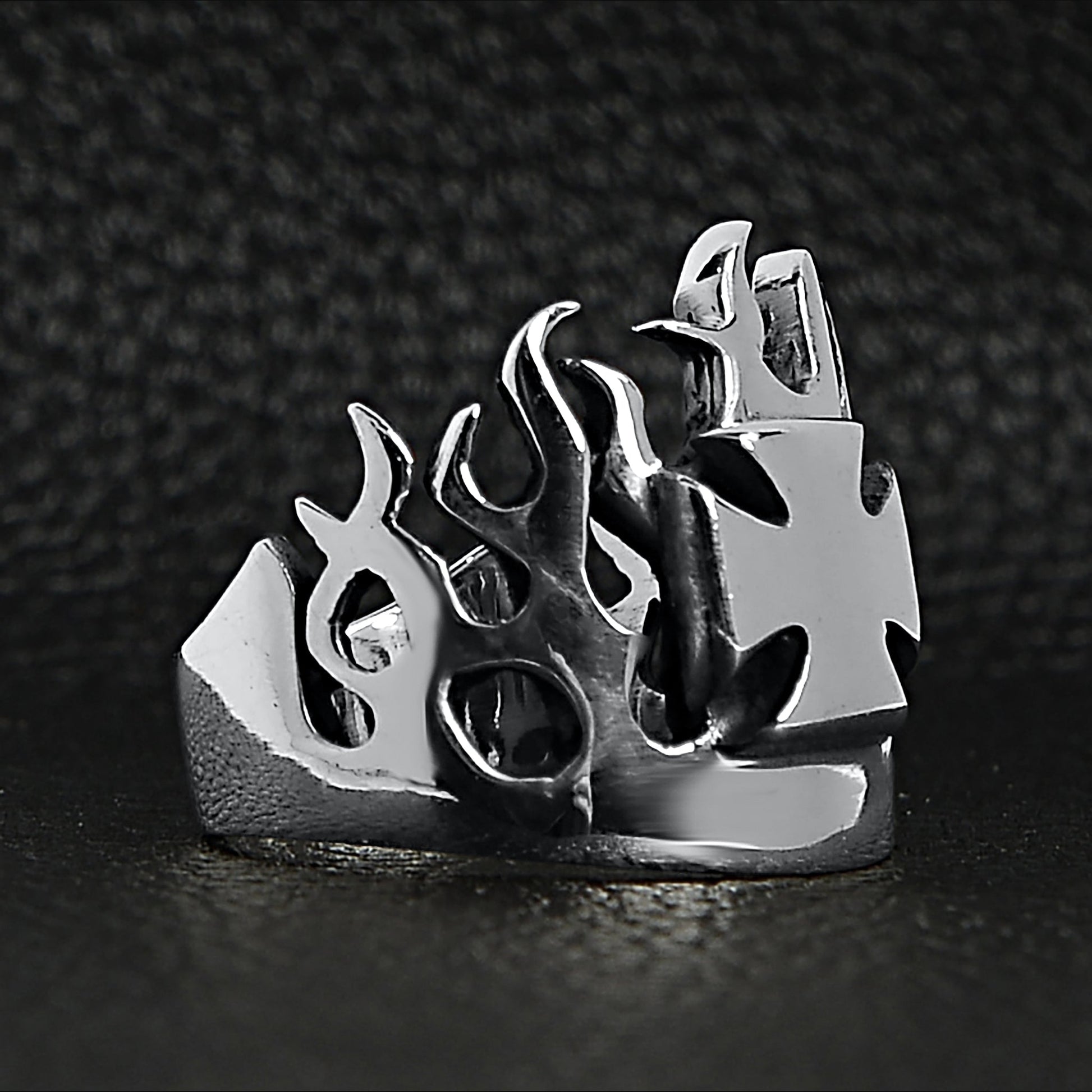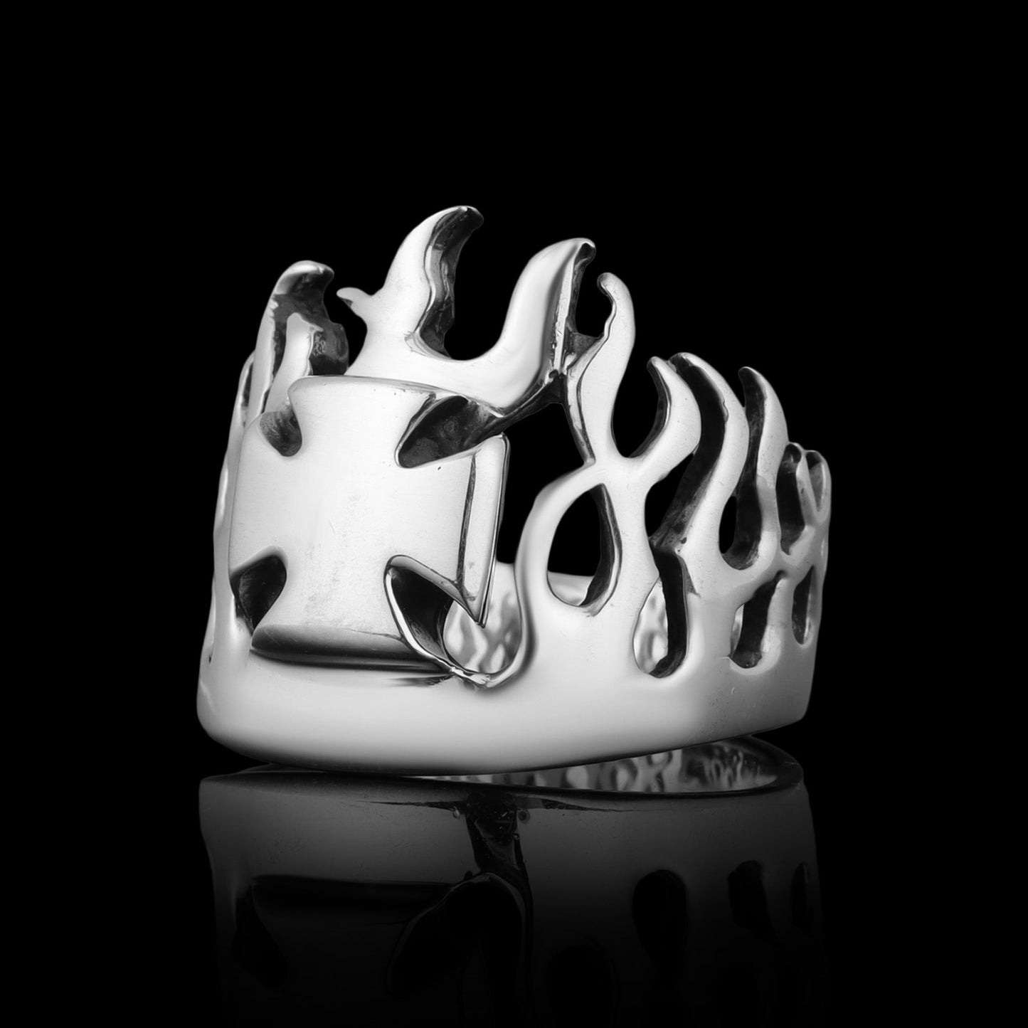 The Sterling Silver Maltese Cross Flame Ring from our Biker Collection is made of premium .925 sterling silver that offers durability even after exhaustive wear. Wear your new sterling silver skull ring from Biker Jewelry Shop without worry on the road, at work, in water or while you sweat, and know that it is crafted with premium materials to last.